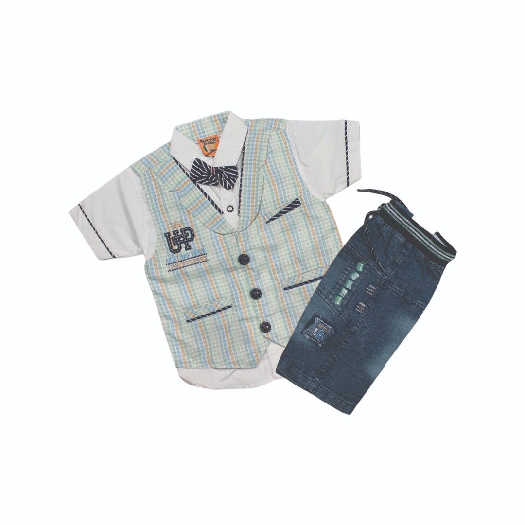 Boys Bow Check-vest Cotton Jersey T-Shirt and Jeans Shorts in 3 Offbeat Colors (4pc)