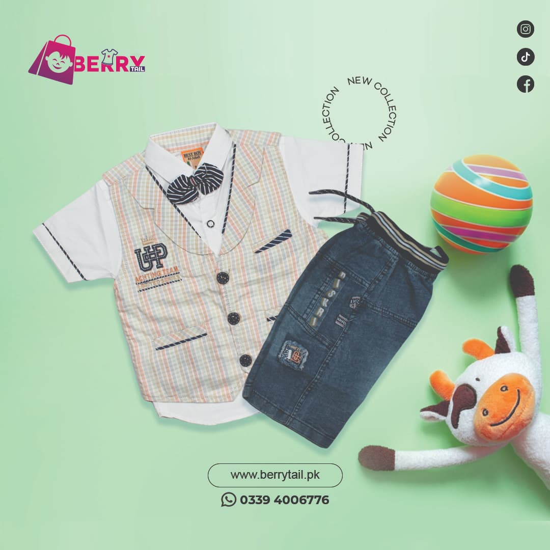 Be the first to review “Boys Bow Check-vest Cotton Jersey T-Shirt and Jeans Shorts in 3 Offbeat Colors (4pc)” Cancel reply