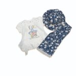 Such a cute set! The cotton jersey shirt is super soft, and the floral trousers are lovely. The hat is a sweet touch