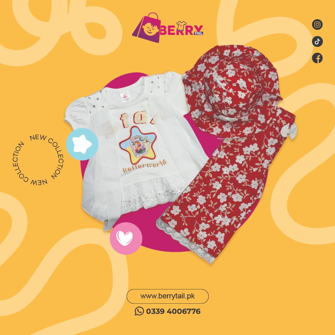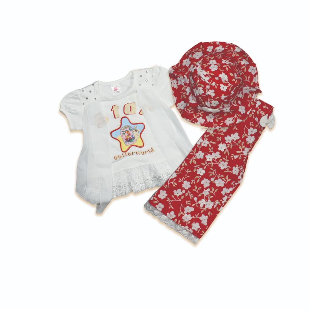 Girls Cotton Jersey Terry Knitted Patch Shirt with Cotton Floral Trouser & Hat in 2 Offbeat Colors (3pc)