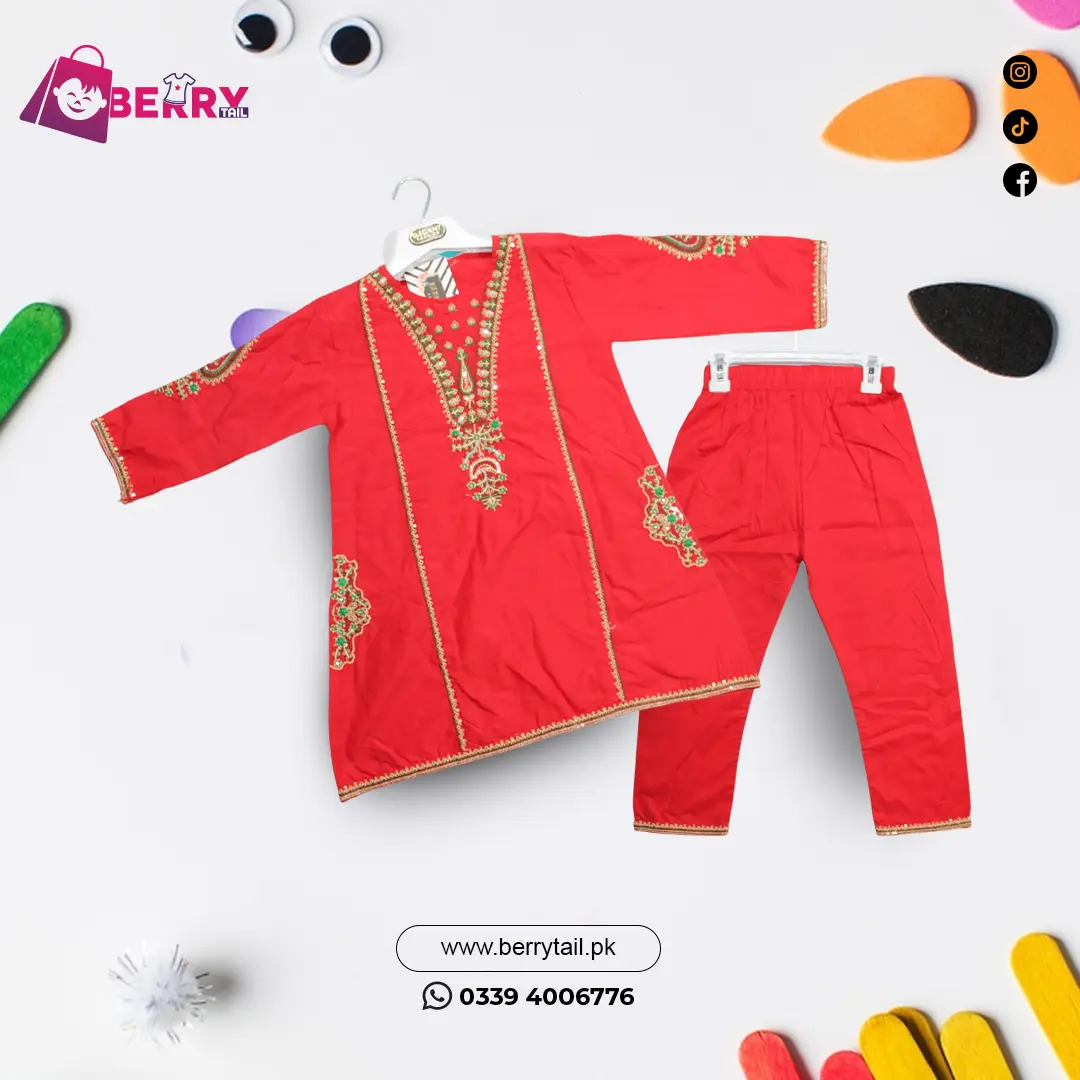 Girls Embroided Cotton Shirt with Cotton Trouser in Red Color (2pc)